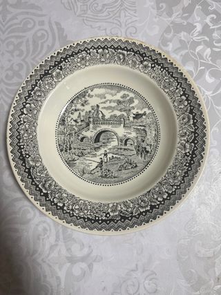 Plato de cerámica con un diseño clásico. - Decoración central de paisaje con puente y figuras. - Borde exterior con motivos florales y greca.