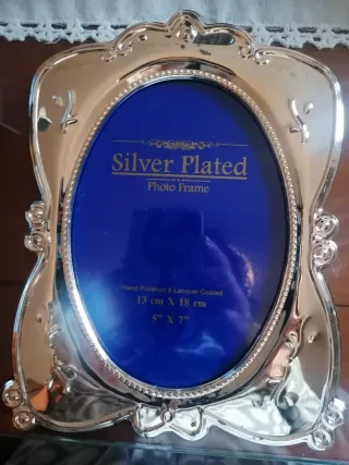 Elegante portafotos con baño de plata, ideal para colocar tus recuerdos más preciados. Su diseño ovalado y acabado pulido le dan un toque sofisticado. - Baño de plata. - Acabado pulido y lacado. - Medidas para foto: 13 cm x 18 cm (5 x 7).
