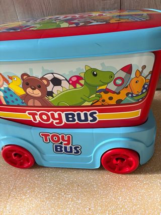 Práctica caja de almacenaje con diseño de autobús para guardar juguetes. Ideal para mantener el orden en la habitación. - Divertido diseño con personajes infantiles. - Tapa con borde azul y base en forma de autobús. - Ruedas rojas para facilitar el movimiento.