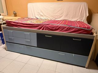 Cama de madera resistente con un diseño moderno y funcional. - Cajones integrados para almacenamiento. - Acabado en tonos azules y marrones.