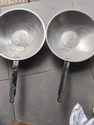 Set de dos sartenes de metal con acabado plateado y mangos negros. Son ideales para cocinar. - Material resistente. - Diseño clásico.
