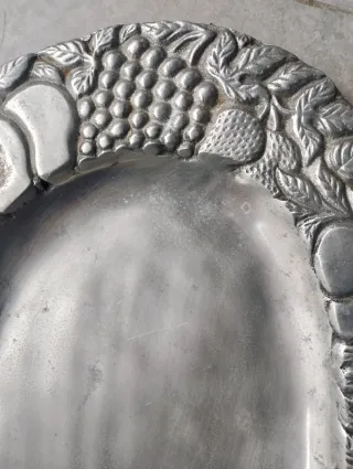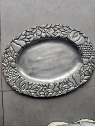 Elegante plato ovalado con un borde decorado con motivos de frutas y hojas. - Diseño intrincado de frutas y follaje. - Acabado metálico plateado.