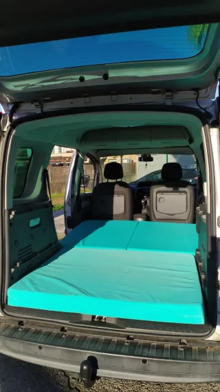 Colchón de 3 piezas diseñado para camperizar tu vehículo. Es cómodo y se adapta al espacio. - Compuesto por 3 secciones. - Color turquesa. - A medida para Renault Kangoo - Apto para todo tipo de furgonetas - Queda una cama de 180cm de largo, anchura de 113 cm en los pies i de 122cm de cintura para arriba.