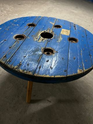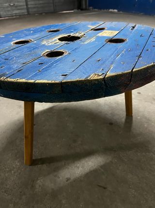 Mesa redonda de madera con un diseño rústico y llamativo. Perfecta para dar un toque único a tu espacio. - Tablero de madera con acabado azul desgastado. - Detalles de clavos y agujeros que le dan carácter. - Base de madera para soporte. - Diametro 0’65cms