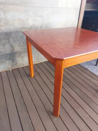 Mesa de madera con un diseño cuadrado y patas robustas. Su acabado le da un toque cálido y natural a cualquier espacio. Tiene algun rasguño, se ve en las fotos. Antes se abria para hacer más grande, ahora ya hay segunda madera.