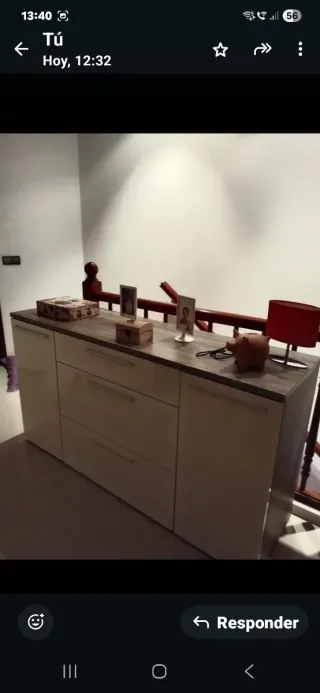 Mueble aparador con un diseño moderno y funcional. Perfecto para añadir un toque de estilo a tu hogar. - Encimera de madera. - Estructura blanca con compartimentos. - Puertas de cristal. Hay que pintar el mueble, no esta roto en ningun lado. Es necesario desmontarlo y llevarselo en Elche