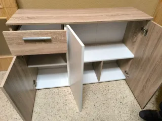 Mueble aparador con un diseño moderno y funcional. - Combinación de acabados en madera y blanco. - Tiradores metálicos. - Patas discretas. Ideal para apartamentos, pisos de alquiler, mueble funcional, sirve como aparador ,recibidor,mueble auxiliar, como nuevo