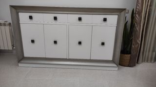Aparador lacado en blanco y gris plata, madera maciza. Medidas: ancho 180cm alto 109cm profundidad 46,5cm
