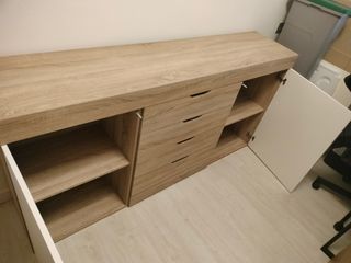 Bonito aparador de madera en tonos beige y blanco. Está en muy buen estado. - Dispone de cuatro cajones y dos puertas. - Perfecto para salón o dormitorio. - Medidas: