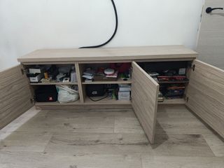 Mueble versátil que puede usarse como mueble de televisión o como aparador. Su diseño moderno y sus acabados en madera le dan un toque elegante a cualquier estancia. - Tres puertas frontales. - Acabado en tonos beige y marrón.