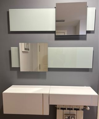Recibidor con espejos movibles sobre espejos blancos. El mueble consta de un cajón y un armario en blanco lacado. El ancho total es de 100 cm y el fondo 26,5 cm. El alto de armario es 24 cm y del cajón 12 cm. El desperfecto más reseñable es un pequeño arañazo en la línea vertical plateada del cajón ( se puede ver en la última foto). No envío. Transporte a cargo del comprador.