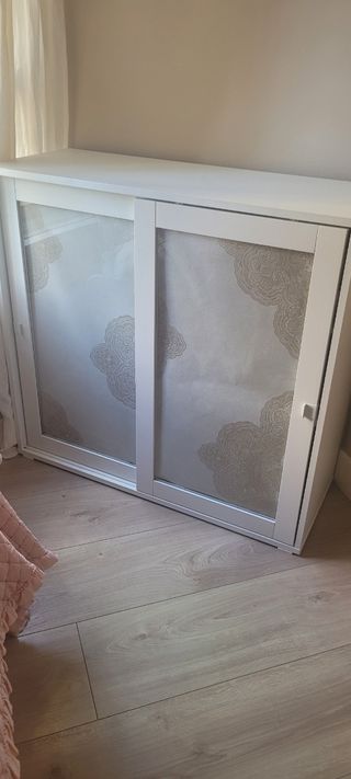 Aparador , con puertas correderas y balda en su interior, las puertas son de cristal transparente aunque le he puesto un papel decorativo que se le puede quitar.