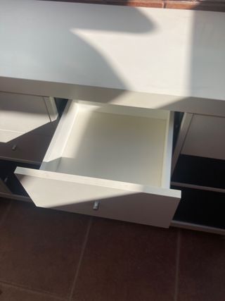 Bonito aparador para TV en blanco y negro. Está en buenas condiciones, aunque presenta algunas señales de uso. - Diseño moderno y elegante. - Perfecto para colocar la televisión y otros aparatos electrónicos. - Ofrece espacio de almacenamiento.