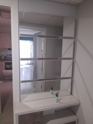 Preciosa y práctica consola para la entrada de casa. Es de madera y tiene un diseño elegante. - Incluye un espejo grande. - Dispone de una balda y un cajón. - Perfecto estado.