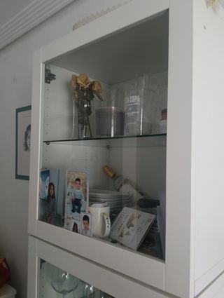 Conjunto de muebles de salón en color blanco, fabricados en madera. Incluye un mueble para TV, dos estanterías con puertas de cristal y cajones. Los muebles están en muy buen estado y son ideales para un salón elegante y espacioso. - Mueble TV con espacio para almacenamiento. - Dos estanterías con puertas de cristal y cajones. - Diseño clásico y elegante. a estado puesto 1 mes medidas el de la TV mide 1,61x45 anchoxalto 65vidriera derecha ancho1,01xalto1,57-vidriera izquierda ancho71x2,05 de alto aparador 1,71ancho x93,5 de alto última foto es estante que va encima de la TV medida 1,41ancho modelo portofino de conforama
