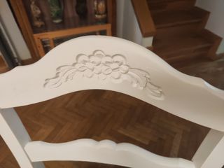 Precioso conjunto de mesa de comedor redonda y cuatro sillas de estilo Provenzal. 120 a 150 cm - Mesa redonda extensible.de 120 a 150. Ocho comensales . - Acabado en blanco. - Sillas con respaldo decorado. Tiene a juego el aparador y sillón con brazos
