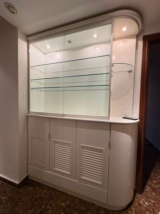 Preciosa vitrina expositora lacada en color blanco. Con iluminacion. Puertas correderas de vidrio y estantes de vidrio también. - Dispone de puertas correderas de cristal y luz en el interior para iluminar lo expuesto en la vitrina. Uno de los focos está fundido. - Se vende sólo la parte superior, la de la vitrina. - Mueble de gran calidad realizado por ebanista y lacado en blanco. - Se ha utilizado para exponer fósiles y antigüedades. colección coleccionista arte decoración diseño estantería balda consola aparador salón comedor vestidor armario