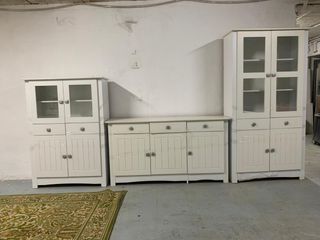 Conjunto de muebles de salón en color blanco. El conjunto incluye un aparador y dos vitrinas. - Aparador con tres cajones y dos puertas. - Vitrinas con puertas de cristal y estantes interiores.