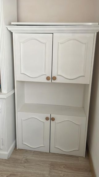 Mueble de almacenamiento con un diseño clásico y elegante. - Dos puertas inferiores con tiradores redondos. - Dos puertas superiores con tiradores redondos. - Estructura de madera. - Acabado en color blanco. - Posiblidad de vender con aparador a juego, junto o por separado