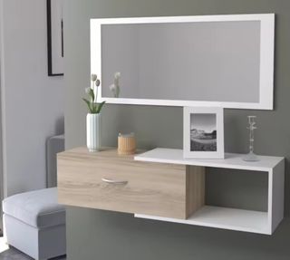Conjunto de espejo y mueble de pared, ideal para recibidor o dormitorio. El mueble combina un cajón de madera con un estante blanco. - Diseño moderno y funcional. - Acabado en madera y blanco. Medidas en foto Se envía nuevo a estrenar, sin montar, montaje fácil con instrucciones, envío gratis, entrega en 7 dias pregunte antes, no se entrega en mano