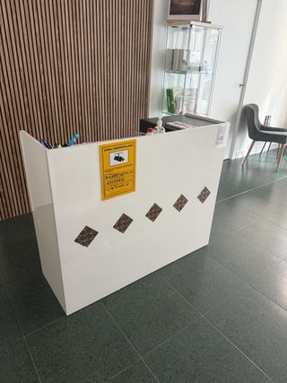 Mostrador de recepción blanco y azul