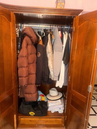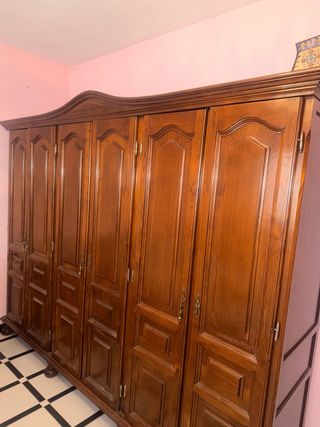 Armario de estilo clásico con un diseño elegante y robusto. - Fabricado en madera de alta calidad. - Acabado en tono marrón oscuro. - Múltiples puertas con tiradores ornamentados. - Diseño con molduras y detalles tallados. Se vende dormitorio completo de estilo clásico en madera maciza. Incluye: • 1 Armario grande (muy espacioso, con barra y estantes) • 1 Cómoda / aparador • 2 Mesitas de noche • Todo en el mismo estilo y conjunto Los muebles están en muy buen estado, muy bien cuidados, sin daños importantes. Se vende por cambio de mobiliario. 👉 Ideal para piso, dormitorio principal o alquiler. Se puede ver y recoger en perso