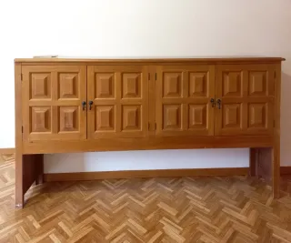 Aparador de madera maciza de roble con un diseño clásico y elegante. - Cuatro puertas con paneles geométricos tallados. - Herrajes de hierro forjado. - Base de apoyo robusta. - Presenta marcas de uso (ver fotos).