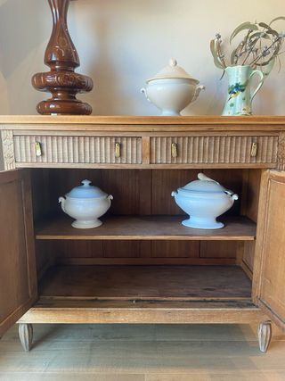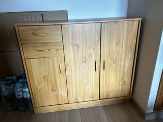 Mueble aparador de madera de pino con un diseño clásico. - Cuenta con dos cajones en la parte superior. - Debajo de los cajones hay un compartimento con puerta. - El resto del mueble se distribuye en dos puertas. - Tiradores de madera integrados. Esta para lijar y darle un lavado de cara, pero a nivel funcional por dentro esta perfecto. Mucho almacenaje. 104 ancho x 35 fondo x 90 alto