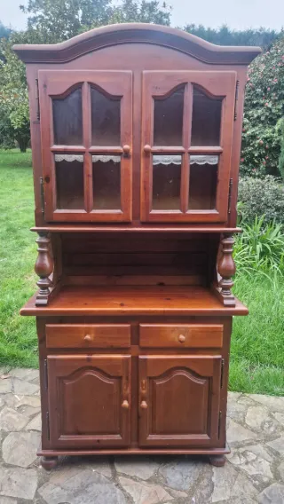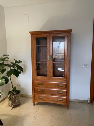 Descripción: Vendo mueble de madera maciza tipo alacena/aparador con vitrina, muy bien conservado y con mucho almacenaje. Estilo clásico, ideal para salón o comedor. ✅ Distribución: • Parte superior con vitrina de 2 puertas de cristal (perfecta para vajilla/copas). • Zona central abierta tipo repisa. • Parte inferior con 2 cajones y 2 puertas con gran capacidad. ℹ️ Estado: En general está muy bien, con algunos desperfectos/roces propios del uso (se aprecia en la foto). Estructura sólida. 📏 Medidas: • Alto: 205 cm • Ancho: 108 cm • Fondo: 42 cm 📍 Entrega: Recogida en mano.