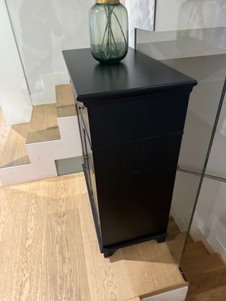 Elegante aparador negro con un diseño clásico y acabados en dorado. Madera maciza. Tiene 4 puertas y 4 cajones. Estable, mueble algo pesado. Hay varios desperfectos, pero le dan un aire vintage y se pueden remediar. Comprado hace unos 20 años en Pilwa y siempre usado o bien en el salon o en la entrada. Es muy bonito y util. Se vende por mudanza‼️ En Barcelona‼️ A recoger antes del 20/02.