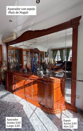 Conjunto de aparador y espejo con un diseño elegante y acabados en Raíz de Nogal. Mesa con 6 sillas , en las fotos salen las medidas de todo! Lo unico usado es el mueble de la tv , todo lo demas es nuevo . Nunca usado!
