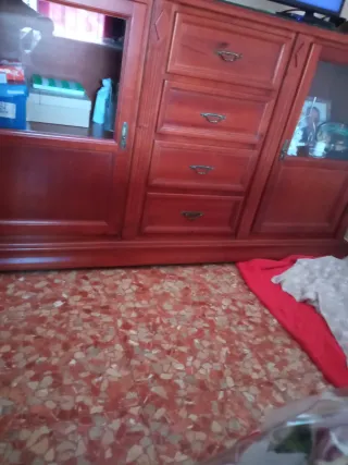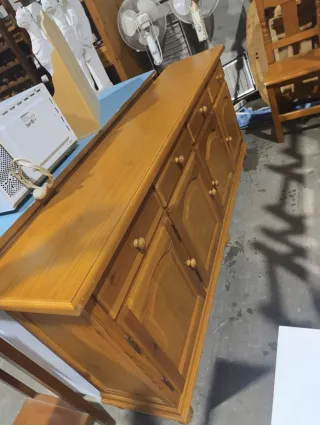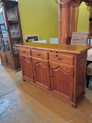Vendo mueble aparador de madera maciza en muy buen estado. Cuenta con 3 cajones superiores y 3 puertas inferiores con gran capacidad de almacenaje. Diseño clásico, robusto y muy duradero, ideal para salón, comedor o casa de campo. La madera tiene un acabado cálido en tono cerezo/caoba que aporta elegancia y combina con muchos estilos de decoración. Medidas aproximadas: 140cmt largo x 60cmt alto Se encuentra en buen estado general, con leves marcas de uso normales.