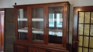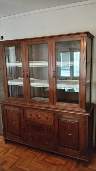 Conjunto de vitrina y aparador de madera de castaño con detalles tallados. Se pueden separar para transporte. Los muebles se encuentran en Pola de Siero. Precio con el conjunto de mesa y sillas: 500 €. - Mueble de gran tamaño y presencia. - Diseño clásico y elegante. - Ideal para salones o comedores.