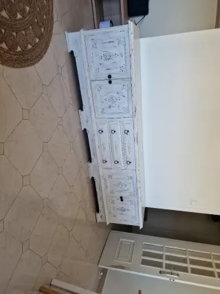 Elegante aparador de madera con un diseño clásico y detalles ornamentales. - Acabado en color beige y blanco con efecto envejecido. - Puertas y cajones con tiradores. - Estructura superior con celosía decorativa. - Patas curvas con un toque francés. Se tiene que recoger en Cartagena ( Murcia)