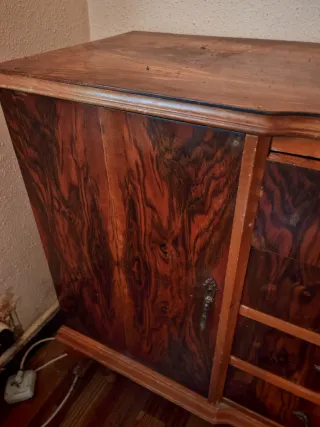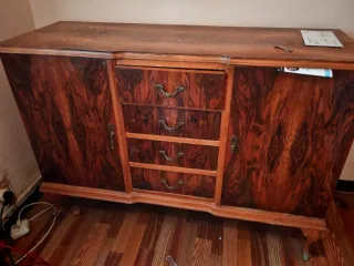 Vendo mueble aparador / buffet de gran calidad y estructura robusta. Es una pieza clásica con detalles de marquetería en puertas y cajones, y herrajes de latón originales. Ideal proyectos restauracion Estado: El mueble está estructuralmente impecable, pero el barniz está velado en algunas zonas (se aprecian manchas blanquecinas por el paso del tiempo). Potencial: Es una pieza perfecta para amantes de la restauración, para lijar y barnizar o para transformar con pintura decorativa (estilo Shabby Chic o moderno). ¡Precio ajustado por el estado del barniz! Una oportunidad para tener un mueble de calidad por muy poco.
