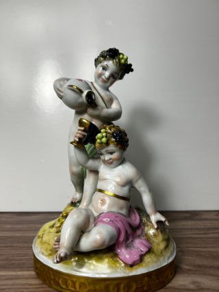 Delicada figura de porcelana artística firmada por Salvador Mallol, representa una escena clásica con Baco sosteniendo una jarra, mientras un querubín reposa con expresión relajada. Ambos están adornados con coronas de uvas, evocando el espíritu de la vendimia y la abundancia. La pieza destaca por su excelente nivel de detalle, colores vibrantes y acabado esmaltado brillante. La base simula un terreno natural con relieves y ribete dorado, aportando elegancia y realismo. Ideal para coleccionistas, amantes de la decoración clásica o como pieza central en vitrinas y aparadores. 🎨 Autor: Salvador Mallol 📏 Medidas aprox: Alto 20cm