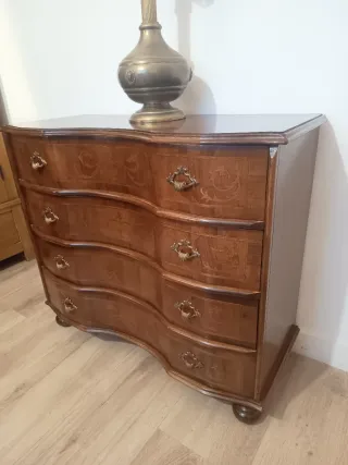 Elegante cómoda de estilo inglés, con un diseño curvo y detalles ornamentales en marquetería, perfecta para añadir un toque clásico a tu hogar. Se conserva en un óptimo estado original. - Firme y funcional, sin arañazos. - Diseño con múltiples cajones y tiradores metálicos originales. Aparador, antiguo, vintage, clásico, original, cajonera, sinfonier, mueble auxiliar, habitación, dormitorio, salón. SE HACEN PORTES Y ENVÍOS. VISITA MI PERFIL PARA VER MÁS PRODUCTOS Y OFERTAS.