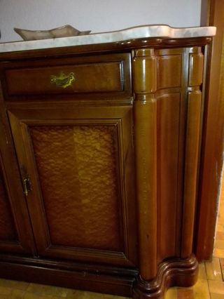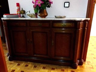 Aparador clásico de madera maciza con encimera de mármol Aparador / mueble auxiliar de estilo clásico, fabricado en madera maciza con encimera de mármol natural. Muy sólido y pesado, ideal para salón, comedor o recibidor. Cuenta con: Varias puertas y cajones con tiradores originales Excelente capacidad de almacenaje Acabado elegante y atemporales. Buen estado general, con ligeras marcas del uso normal que se aprecian en la madera y le dan carácter. Estructuralmente perfecto. * Recogida: Solo recogida en mano, cuarta planta (mueble pesado). Ideal para quien busca un mueble auténtico, de calidad, mucho mejor que mobiliario moderno.