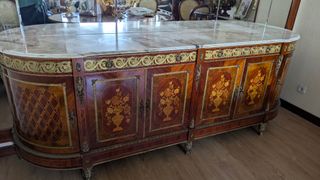 Elegante aparador de comedor de estilo clásico. Presenta un diseño curvo y detalles ornamentales dorados. - Encimera de mármol. - Frontales con marquetería de madera. - Patas metálicas decoradas.