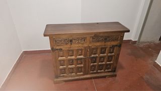 Mueble aparador de madera maciza con un diseño clásico y detalles tallados. - Dos cajones superiores con tiradores negros. - Dos puertas inferiores con paneles decorativos. - Herrajes metálicos en las puertas. El interior esta forrado pero se puede quitar, tiene signos de uso pero es perfecta para restaurar y dar un poco de amor!