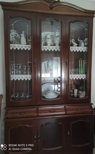 Preciosa y robusta mueble aparador de madera, ideal para salón. Tiene un diseño clásico y elegante. - Perfecto estado de conservación. - Gran capacidad de almacenaje con estantes, cajones y puertas con cristal. - Medidas: (Añadir medidas reales) - Se vende en una sola pieza.