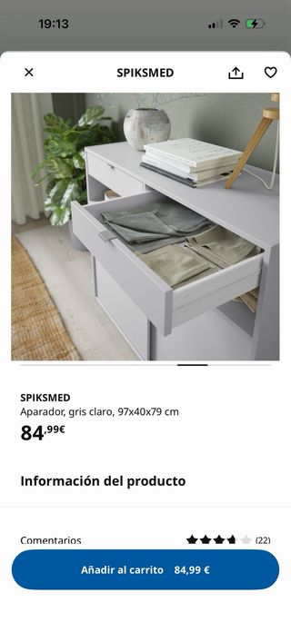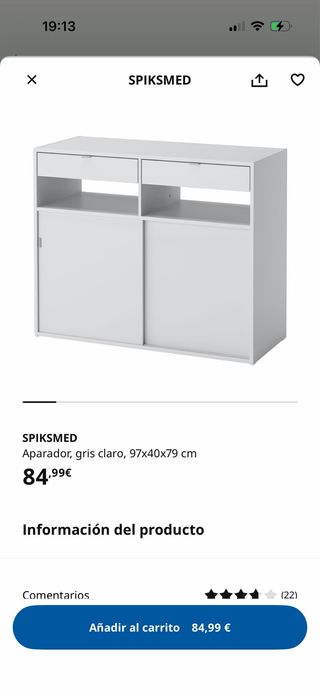 Aparador SPIKSMED de Ikea en color gris claro. Sus medidas son 97x40x79 cm. - Dos cajones superiores. - Puertas correderas.