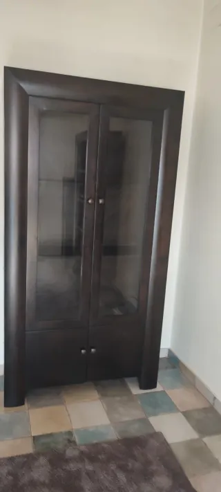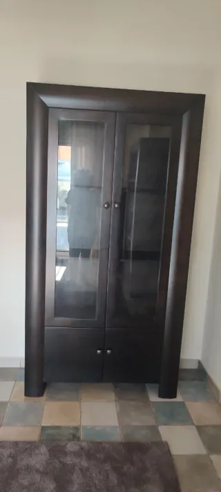 Elegante vitrina de madera maciza con puertas de cristal para exhibir tus objetos. - Diseño clásico y robusto. - Amplio espacio de almacenamiento. - Acabado en tono madera oscura. Tiene una esquina un poco arañada pero se disimula bastante y es facil arreglarlo