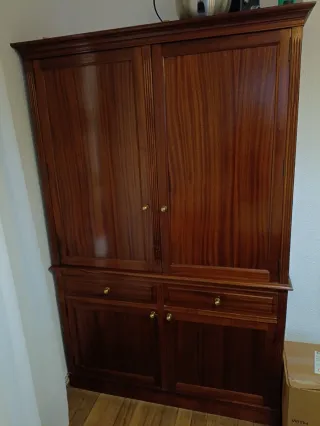 Se vende armario de madera de gran calidad, muy sólido y pesado. Ideal como vitrina, armario auxiliar o mueble de salón/comedor. 🔹 Estructura de madera resistente 🔹 Parte superior con puertas acristaladas y dos lejas de cristal grueso 🔹 Parte inferior con dos cajones amplios 🔹 Gran capacidad de almacenaje 🔹 Mueble muy estable y duradero 📏 Medidas: • Alto: 215 cm • Ancho: 125 cm • Fondo: 40 cm 📦 Recogida en domicilio (mueble pesado, recomendable venir mínimo dos personas). Estado general bueno, con señales normales de uso. Se vende por falta de espacio. PRECIO NO NEGOCIABLE