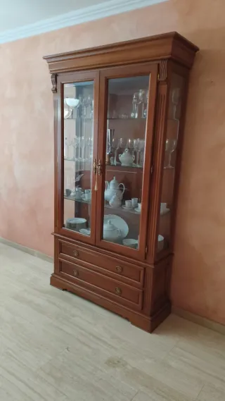 Vendo vitrina–aparador de madera maciza, robusta y de estilo clásico, ideal para salón o comedor. Mueble muy amplio y funcional, con gran capacidad de almacenaje: vitrinas con cristal para vajilla o decoración, varios armarios cerrados, cajones centrales y estanterías abiertas. Está en buen estado general, bien cuidada, con herrajes originales y un acabado en madera natural muy elegante. Perfecta para guardar copas, platos, libros o cualquier objeto decorativo, aportando un toque clásico y acogedor al hogar. Mueble sólido y duradero, de los de antes. Ideal para quien busca calidad, espacio y estilo.