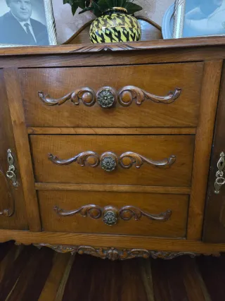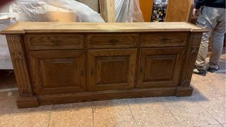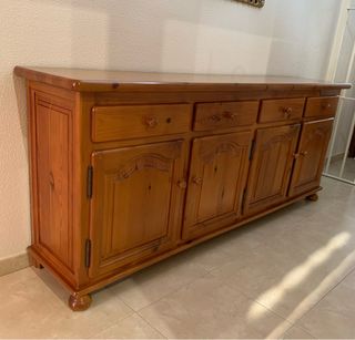 Aparador de madera maciza, robusto y de gran calidad. Mueble pesado y muy estable, ideal para comedor, salón o recibidor. Dispone de: • 2 puertas laterales • 4 cajones centrales amplios • Gran superficie superior para apoyar lámparas, decoración o TV Estilo rústico / colonial, madera natural con vetas visibles y tiradores metálicos. En buen estado general, con marcas normales de uso en la parte superior (ver fotos), que no afectan a su funcionalidad ni estructura.