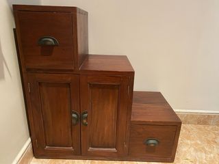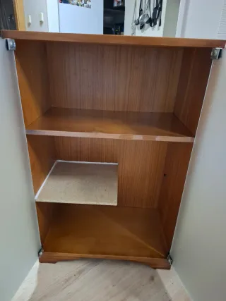 Precioso y original mueble esquinero de madera maciza color caoba. Sirve como escalera. Ideal para una biblioteca o como mesa auxiliar. Medidas dibujadas sobre la tercera foto. Se compone de dos cajones y dos estanterías. Esta en perfecto estado. Recogida en persona. No se envía debido al peso ya que es de muy buena calidad. Adquirido en El Corte Inglés