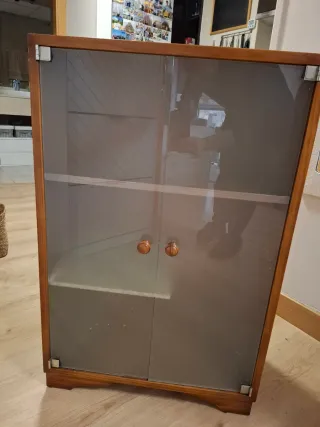 Mueble de madera maciza con puertas de cristal. - Diseño elegante y funcional. - Acabado en tono marrón natural. - Ideal para almacenar y exhibir objetos.