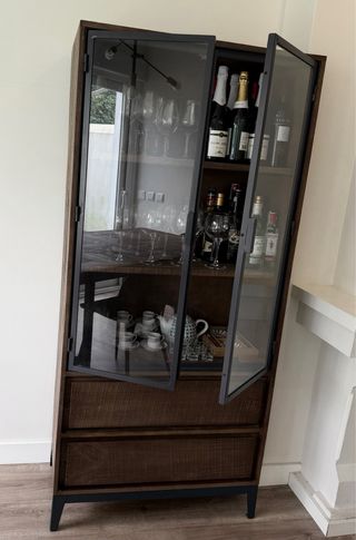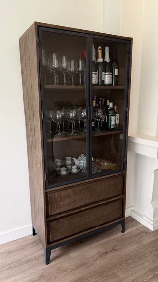 Vitrina de madera maciza con puertas de cristal y detalles metálicos.