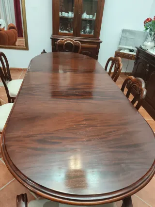 Conjunto de comedor elegante en madera maciza de teca. Incluye una mesa ovalada y seis sillas, vitrina y aparador. - Mesa de comedor de madera maciza. - Seis sillas a juego con tapizado. - Acabado en madera de teca.